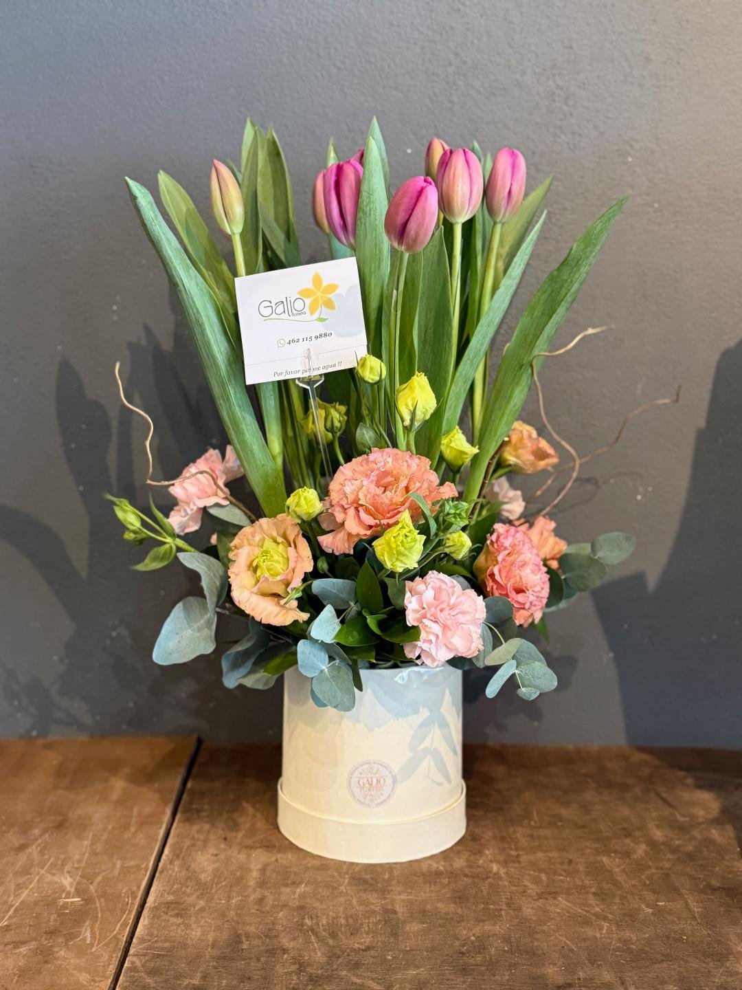 Arreglo con 10 tulipanes en caja de carton combinado con minirosas y lisiantus
