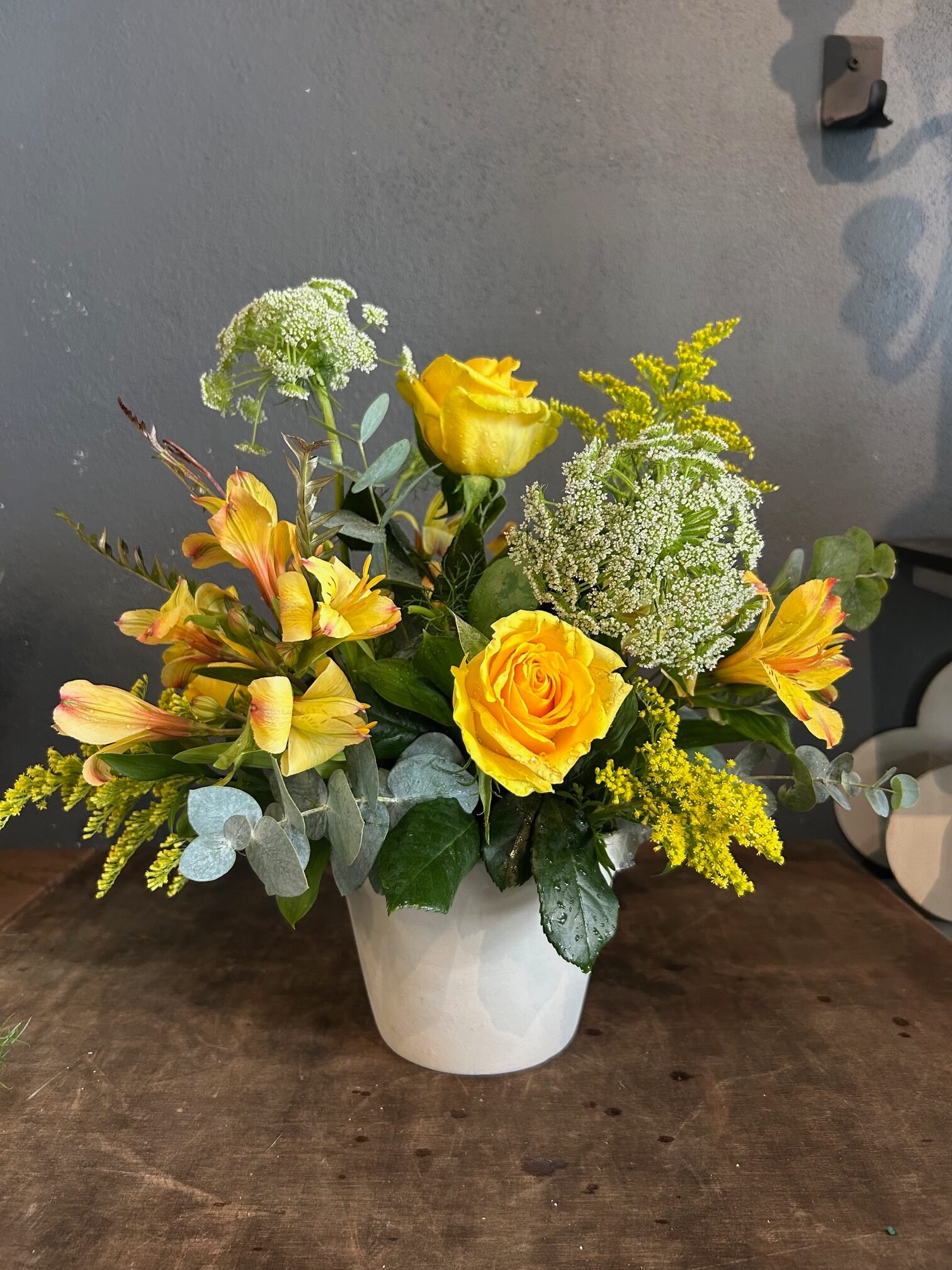 Arreglo combinado de flores amarillas, gerberas, lilis, minirosas y otras flores en caja de cartón negra