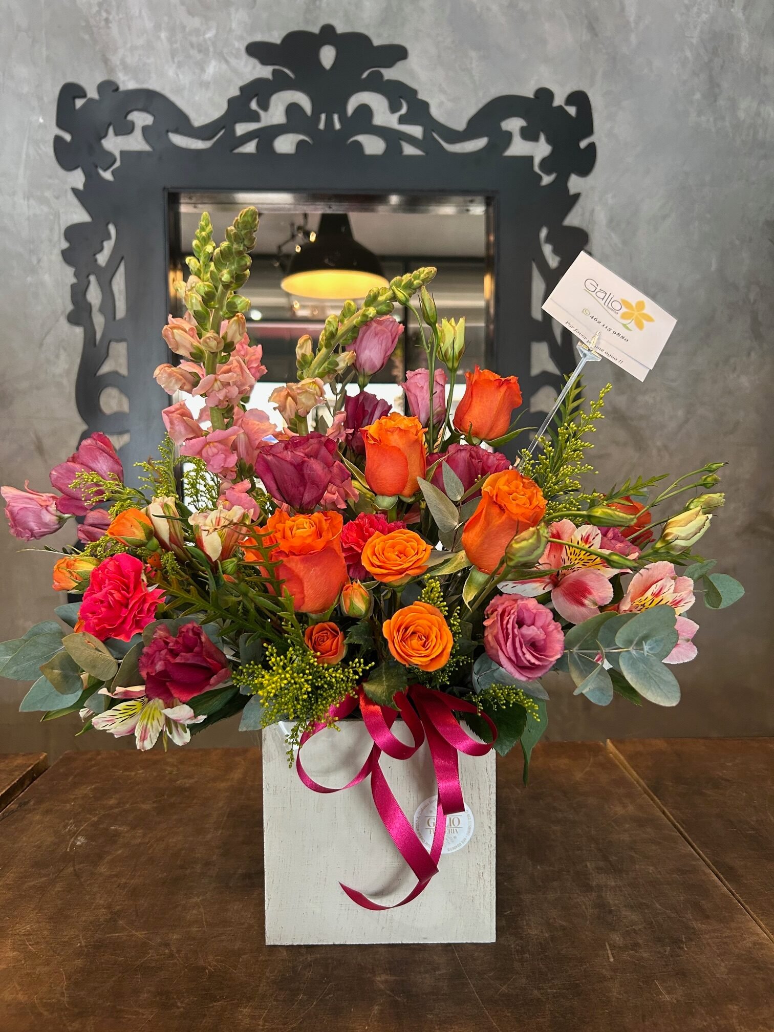 Arreglo combinado con rosas, minirosas, perritos, astromelias y lisiantus en base de madera