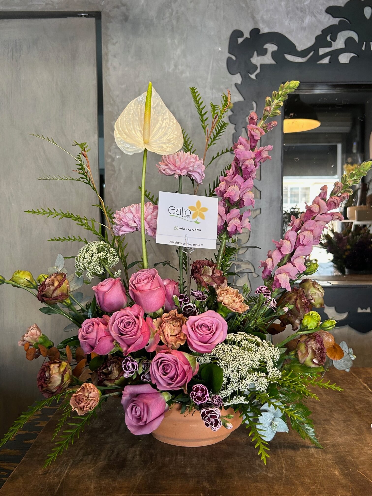 Arreglo combinado con rosas, perritos, flor de cebolla y dolar tratado (este arreglo requiere pedirse minimo un dia antes)