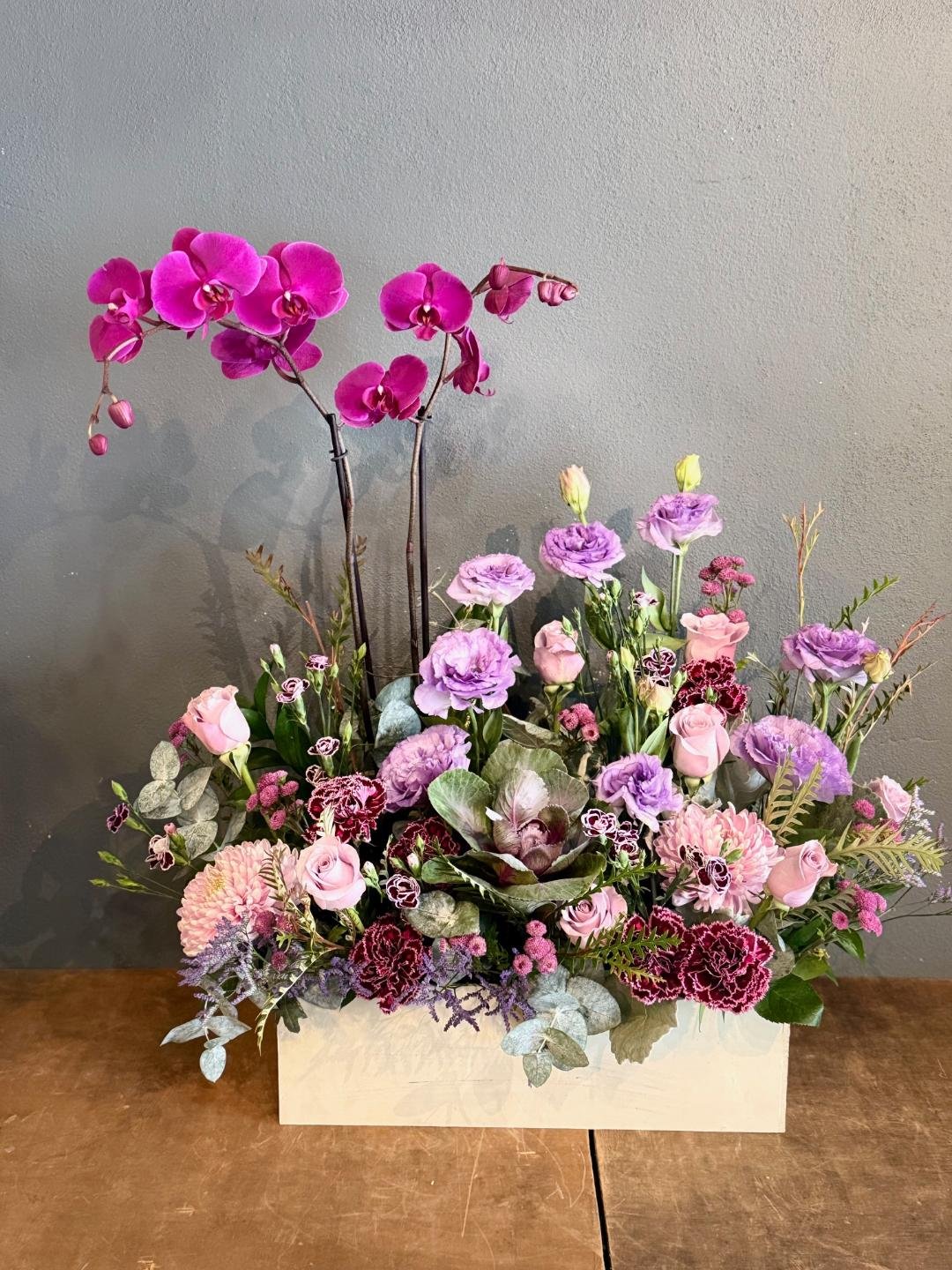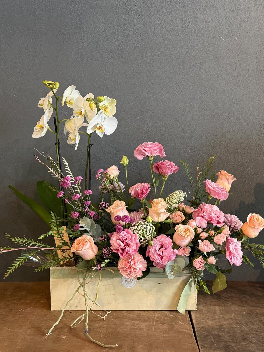 Arreglo con orquidea y combinado con otras flores, rosas, minirosas, lisiantus etc