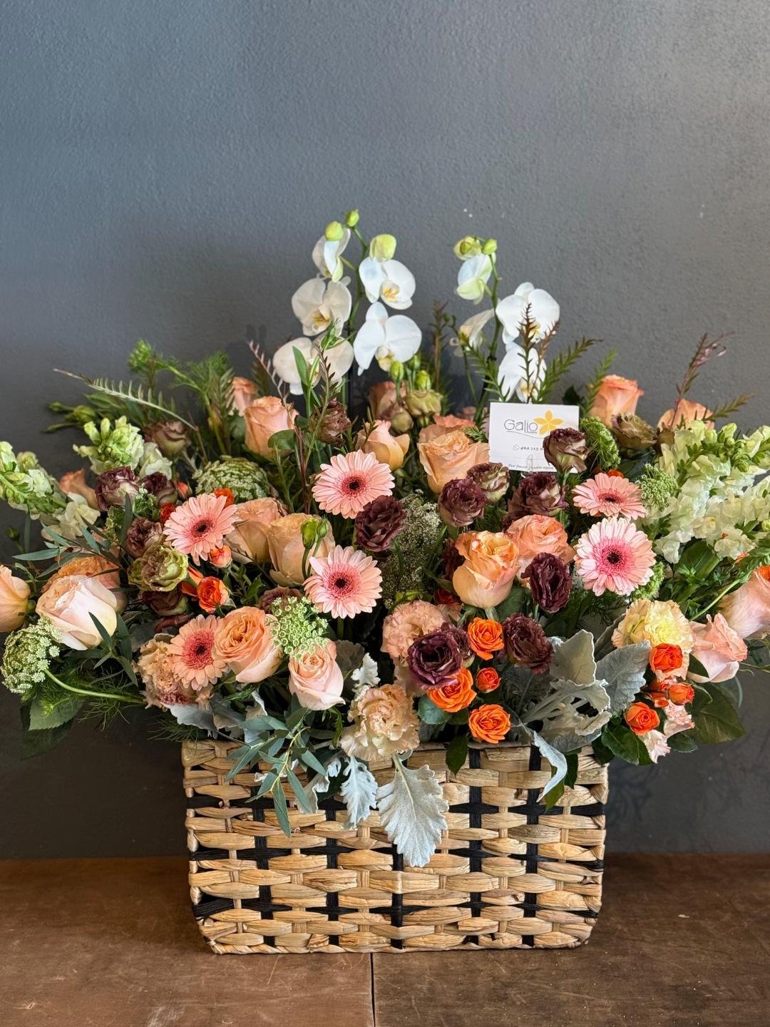 Arreglo grande en canasta con 2 macetas de orquidea y variedad de muchas flores y flollajes finos