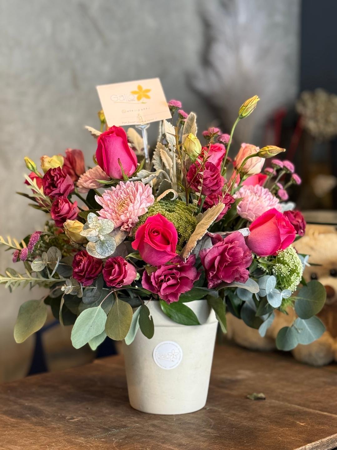Arreglo mediano combinado con rosas, roxanas lisiatus y otros. La base puede cambiar