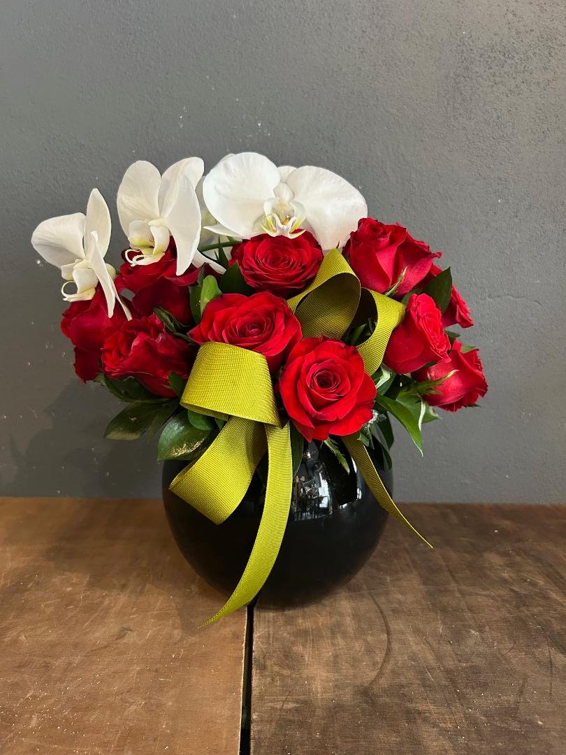 Arreglo en pecera negra con 24 rosas rojas y 1 vara de orquidea phalenopsis