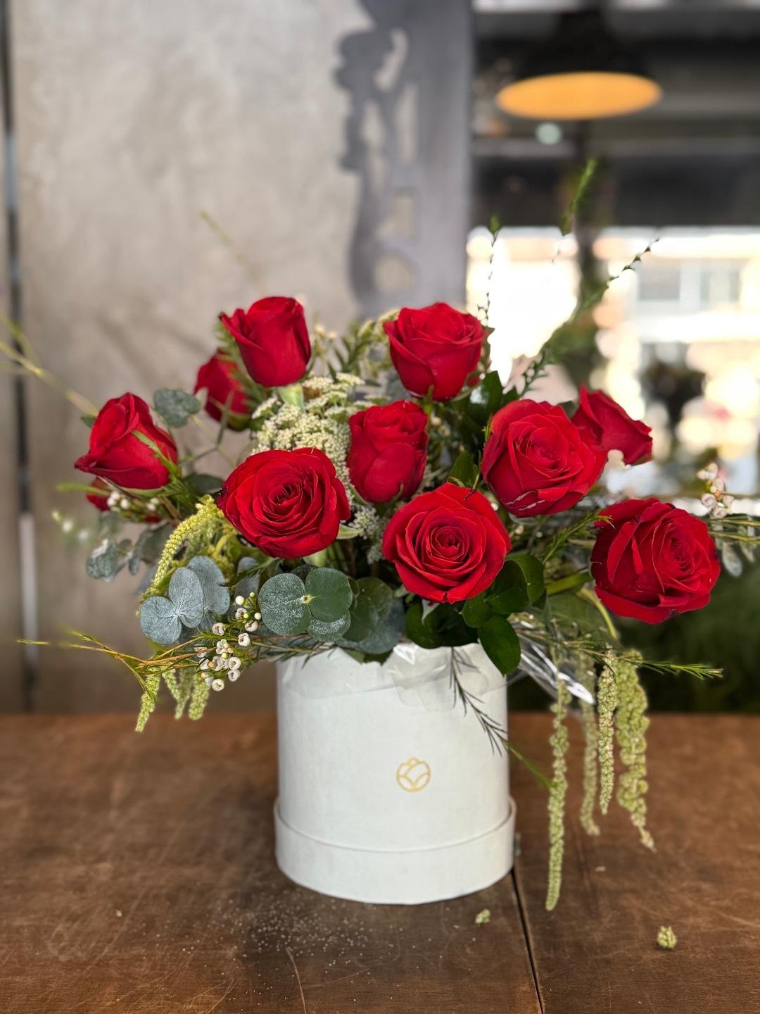Arreglo en caja de carton con 15 rosas rojas y dolar
