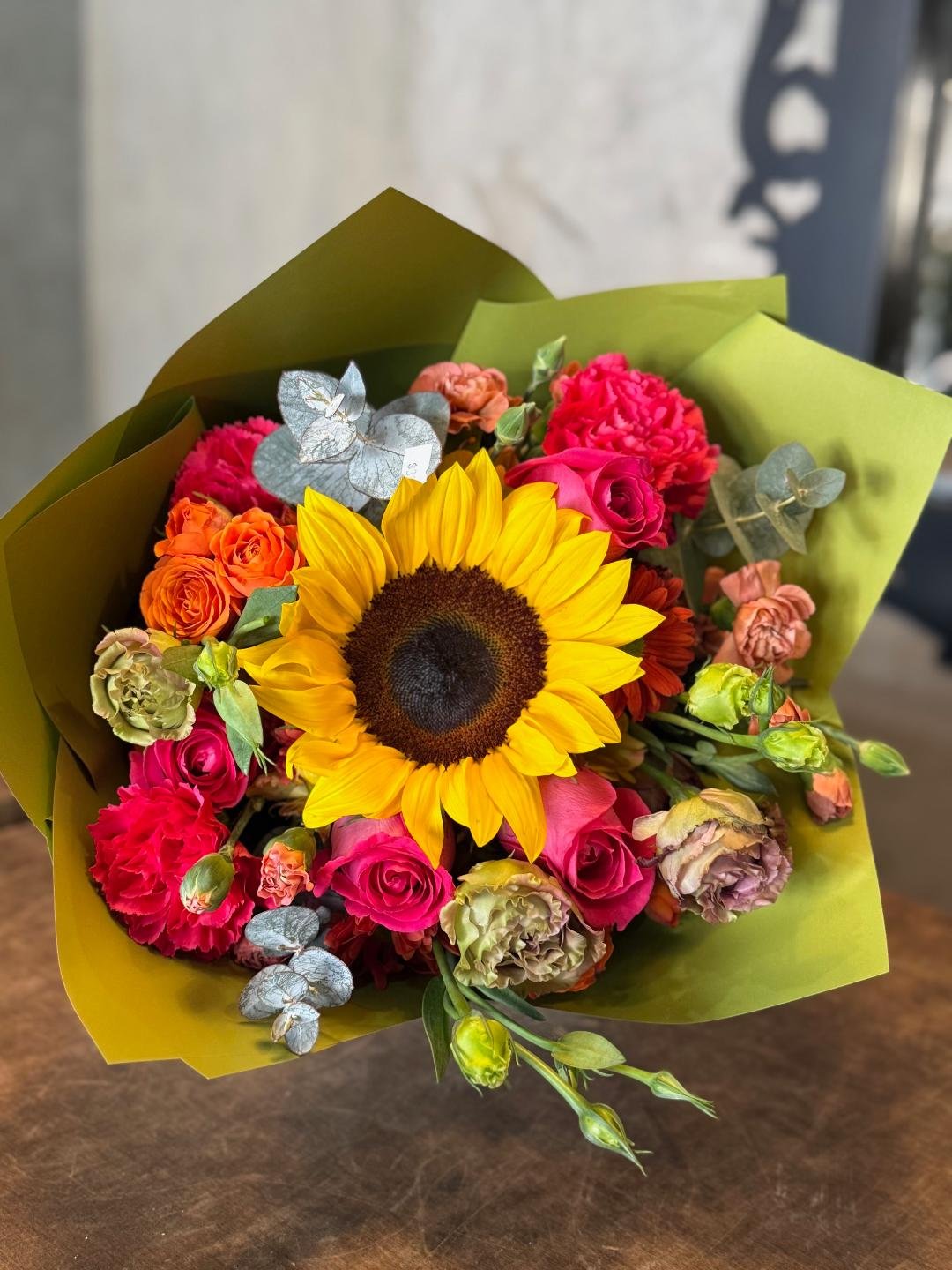 Arreglo atado con girasol, rosas, lisiantus claveles y otras flores y follajes