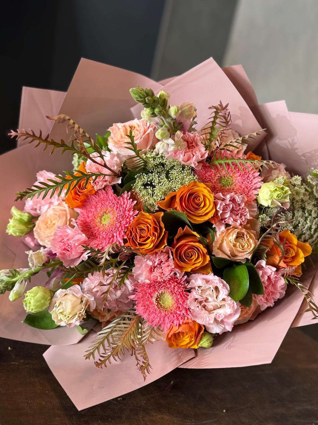 Arreglo atado combinado con rosas, gerberas y otras flores y follajes