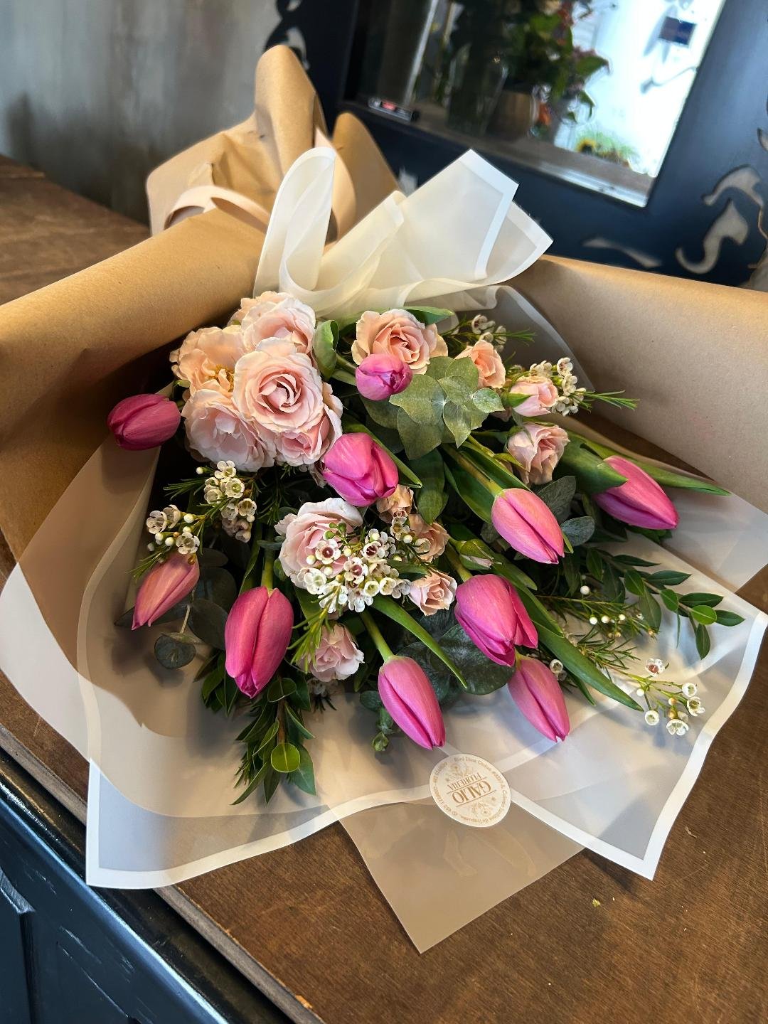 Arreglo atado de 10 tulipanes con otras flores y follajes
