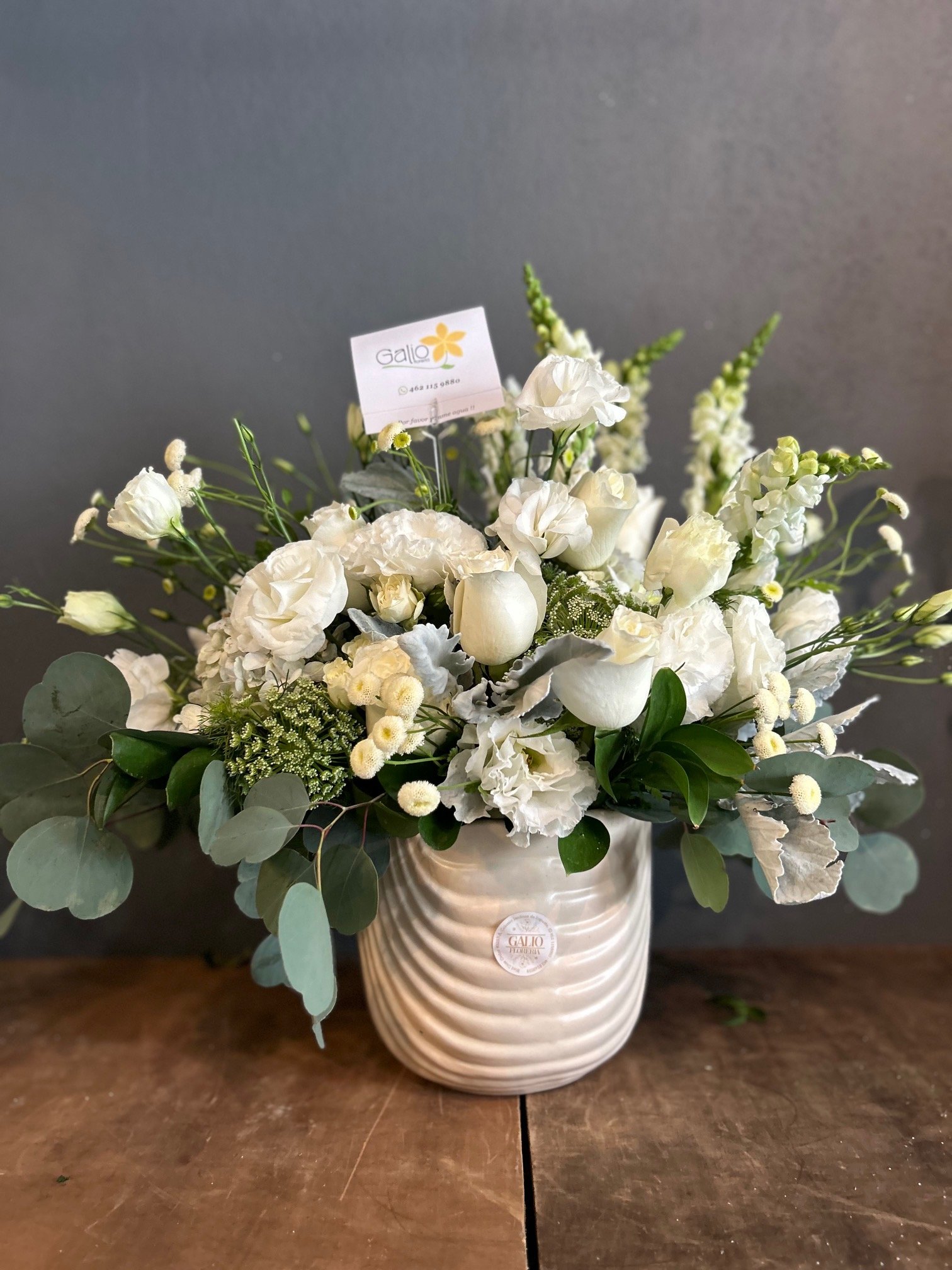 Arreglo para condolencias, en combinacion de flores, rosas, lisiantus, perritos y otras flores y follajes