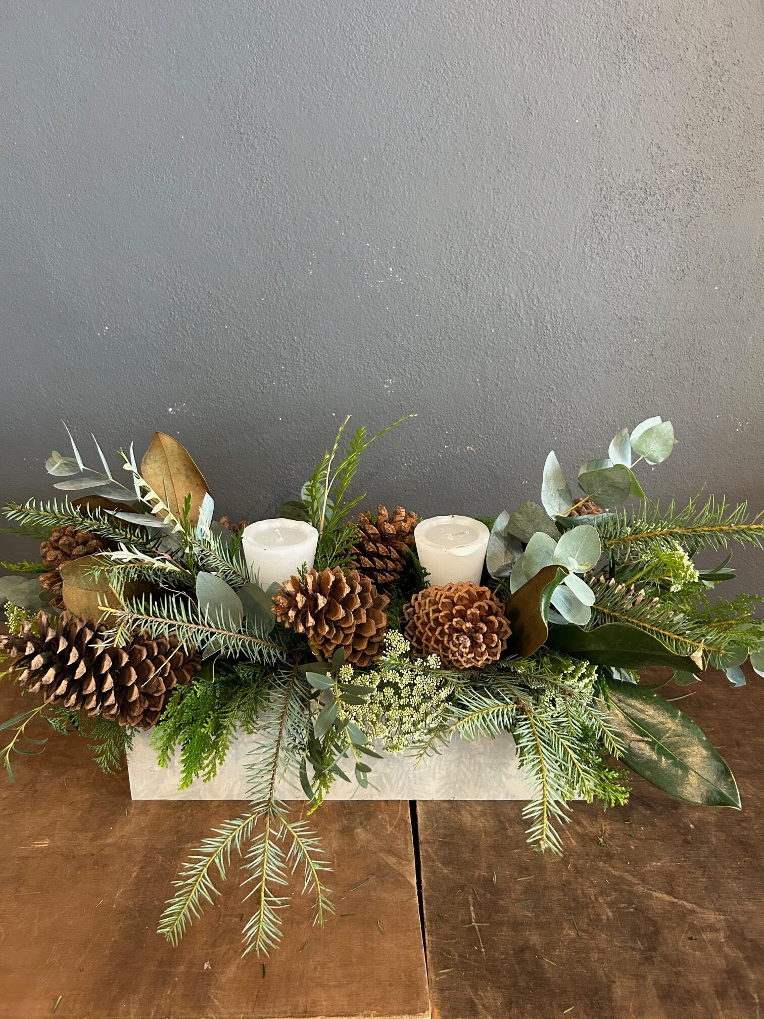 Arreglo con follajes y accesorios navideños, aprox 60 cm tomando en cuenta las puntas del follaje